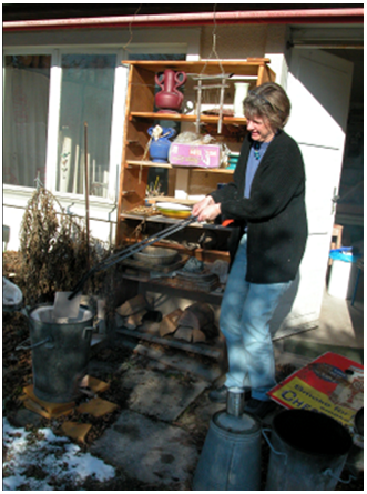 Le RAKU Le RAKU est une technique de cuisson japonaise datant du 16e siècle. Dans mon atelier la cuisson RAKU se fait au jardin, au feu de bois, dans une vieille poubelle dont j’ai isolé l’intérieur et à laquelle j’ai ajouté une cheminée.